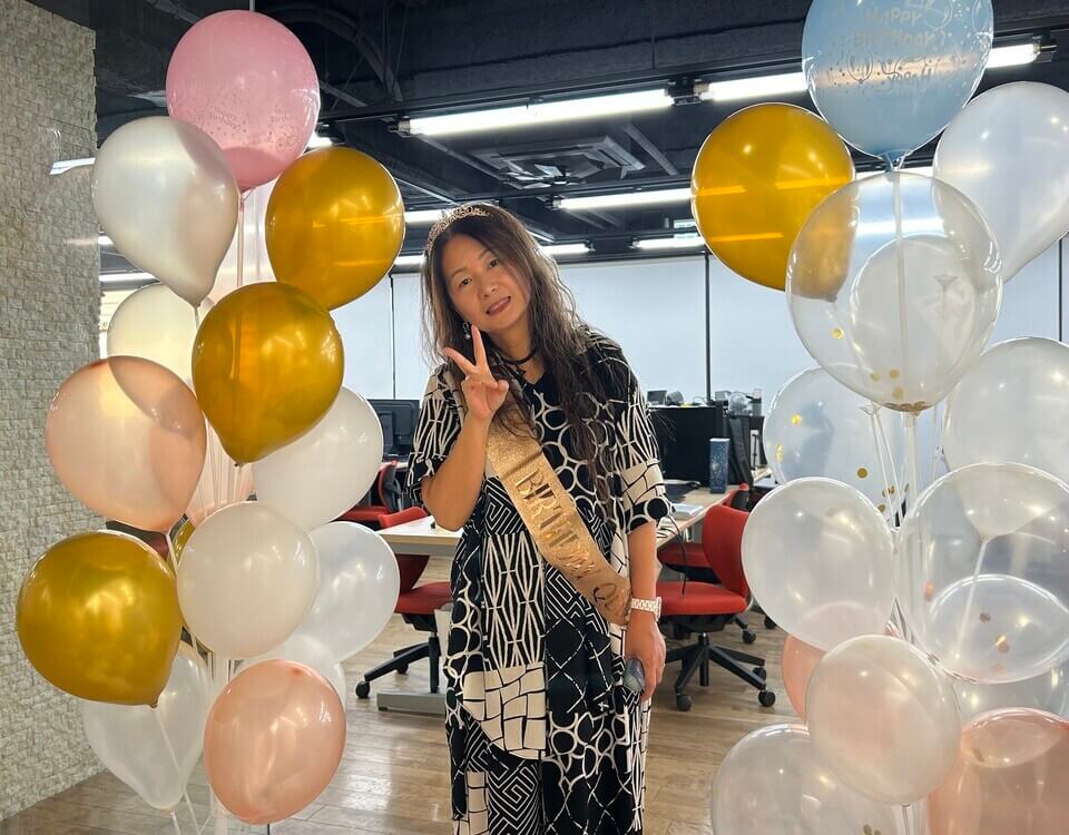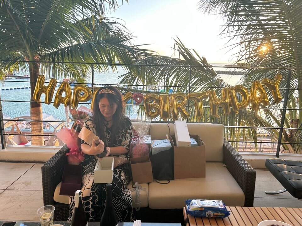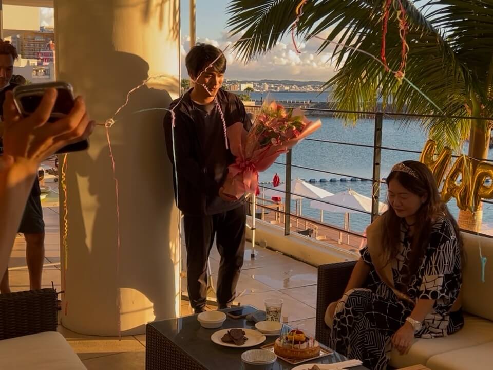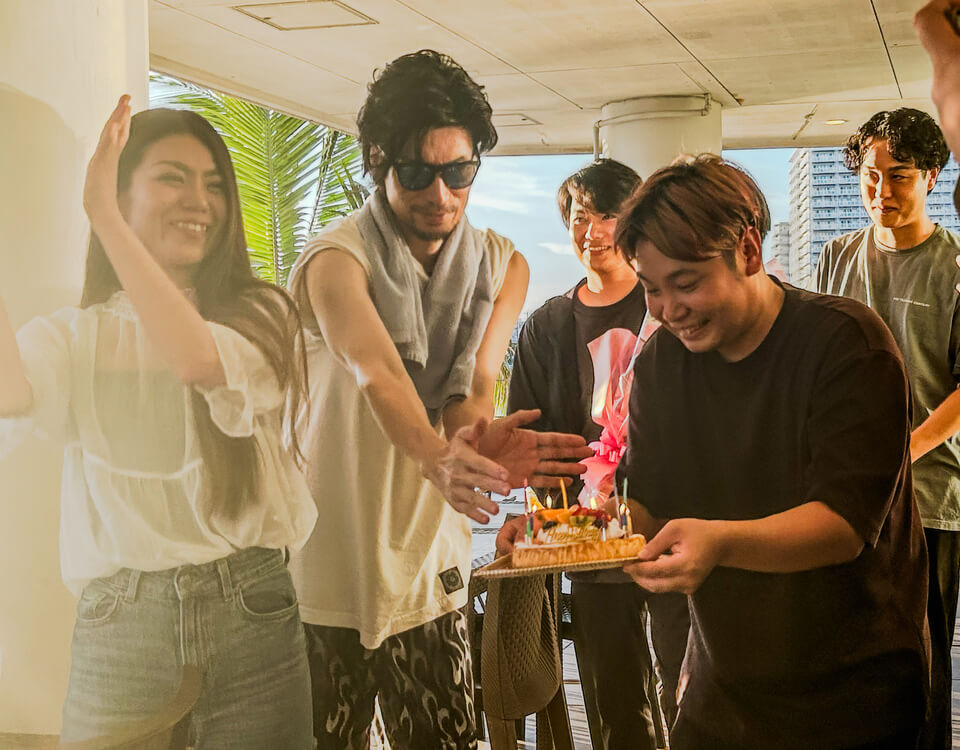 今回の主役は、我らが社長!会社のテラスでお祝いしました。